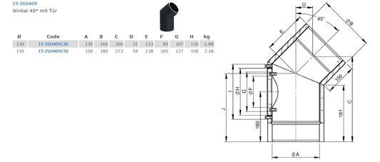 doppelwandiges Ofenrohr, Bogen 45°, Ø 130 mm mit Tür